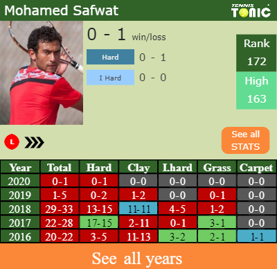 The Egyptian has a 0-1 win-loss record in 2020, 0-1 on hard (See FULL STATS).