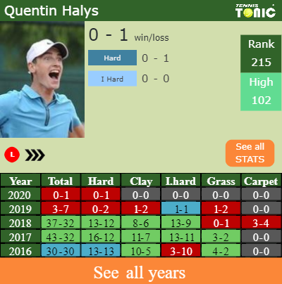 The French Player has a 0-1 win-loss record in 2020, 0-1 on hard (See FULL STATS).