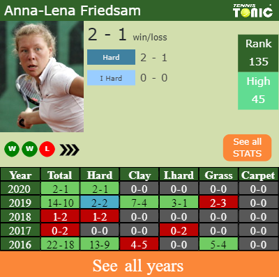 Talking about her overall career, Friedsam has an overall 81-80 record. She has negative 26-32 record on hard.