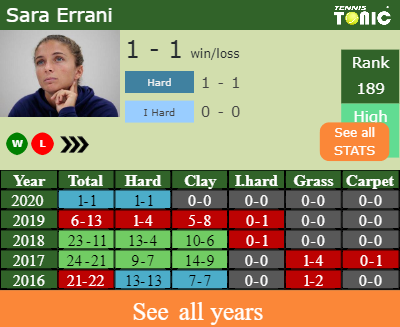 Sara has a 1-1 win-loss record in 2020, 1-1 on hard (See FULL STATS).