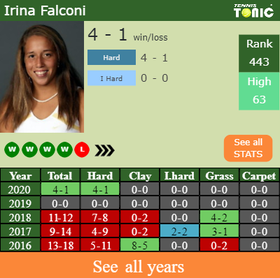 Falconi has a 4-1 win-loss record in 2020, 4-1 on hard (See FULL STATS).