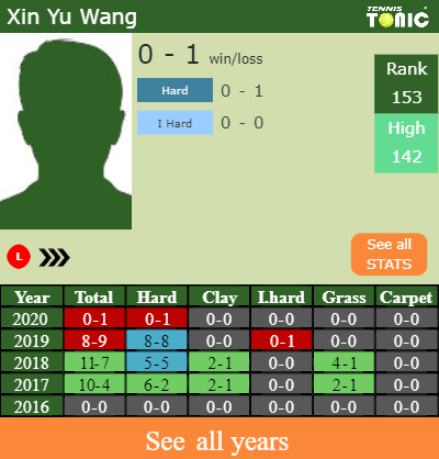 Yu Wang has a 0-1 win-loss record in 2020, 0-1 on hard (See FULL STATS).