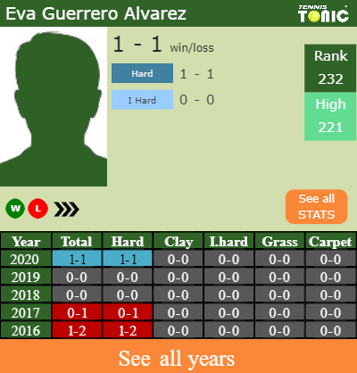 Eva has a 1-1 win-loss record in 2020, 1-1 on hard (See FULL STATS).