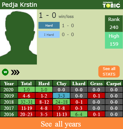 Krstin has a negative record in the last 10 years having won 38% of his matches (148-241). 1-0 on hard in 2020 In connection with his performance on the same surface of this tournament, Krstin has a 102-127 win-loss record in the last 10 years on hard.