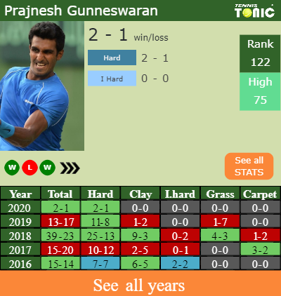 Gunneswaran has a negative record in the last 9 years having won 42% of his matches (487-350). 2-1 on hard in 2020 Talking about his performance on the same surface of this event, Gunneswaran has a 99-87 win-loss record in the last 9 years on hard.