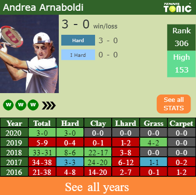 Arnaboldi has a negative win-loss record in the last 10 years having won 46% of his matches (197-230). 3-0 on hard in 2020 Talking about his performance on the same surface of this competition, Arnaboldi has a 221-251 win-loss record in the last 10 years on hard.