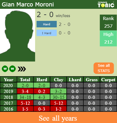 Marco Moroni has a 2-0 win-loss record in 2020, 2-0 on hard (See FULL STATS).