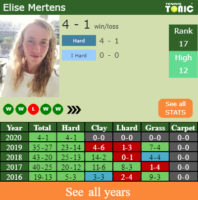 Mertens has a losing win-loss record in the last 8 years having won 36% of her matches (549-308). 4-1 on hard in 2020 In connection with her performance on the same surface of this tournament, Mertens has a 156-100 record in the last 8 years on hard.