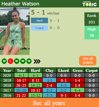 Watson has a winning win-loss record in the last 10 years having won 52% of her matches (607-561). 4-1 on hard in 2020 In connection with her performance on the same surface of this competition, Watson has a 192-184 win-loss record in the last 10 years on hard.