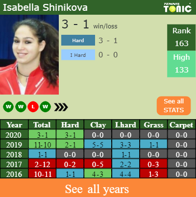 Shinikova has a winning record in the last 7 years having won 59% of her matches (42-29). 3-1 on hard in 2020. In connection with her performance on the same surface of this event, Shinikova has a 28-38 win-loss record in the last 7 years on hard.