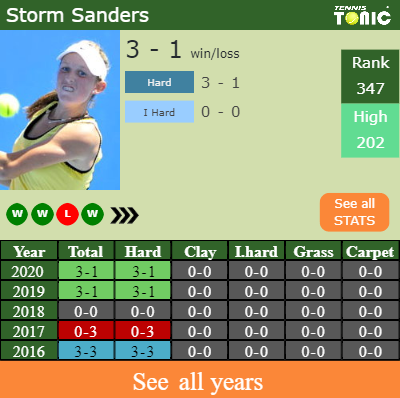 Sanders has a negative record in the last 7 years having won 49% of her matches (76-80). 3-1 on hard in 2020. In connection with her performance on the same surface of this event, Sanders has a 14-22 record in the last 7 years on hard.
