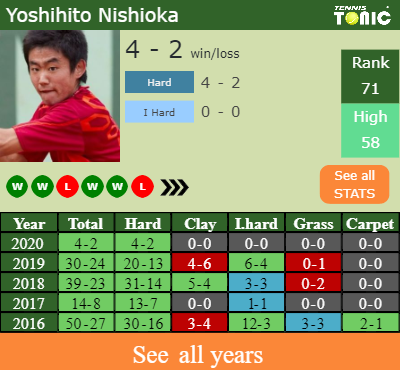 Yoshihito has a 4-2 win-loss record in 2020, 4-2 on hard (See FULL STATS).