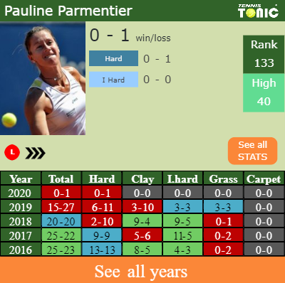Parmentier has a 0-1 win-loss record in 2020, 0-1 on hard (See FULL STATS).