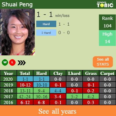Peng has a 1-1 win-loss record in 2020, 1-1 on hard (See FULL STATS).
