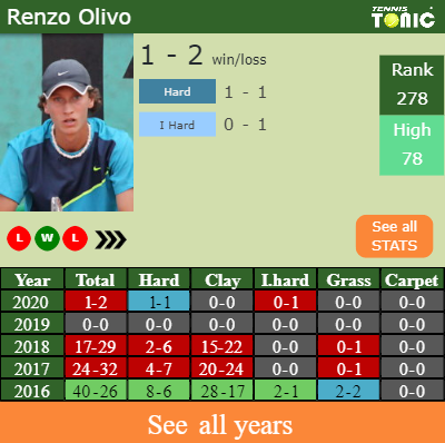 Renzo has a 1-2 win-loss record in 2020, 1-1 on hard (See FULL STATS).