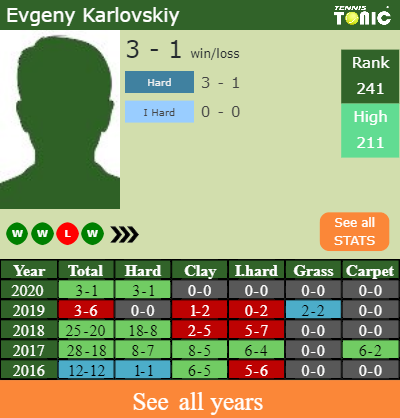 Karlovskiy has a 3-1 win-loss record in 2020, 3-1 on hard (See FULL STATS).