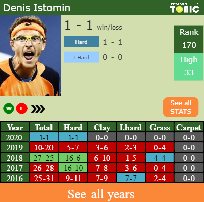 The Uzbek has a 1-1 win-loss record in 2020, 1-1 on hard (See FULL STATS).