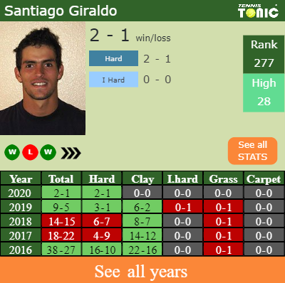 Giraldo has a negative win-loss record in the last 10 years having won 49% of his matches (330-344). 2-1 on hard in 2020. Regarding his performance on the same surface of this tournament, Giraldo has a 236-204 record in the last 10 years on hard.
