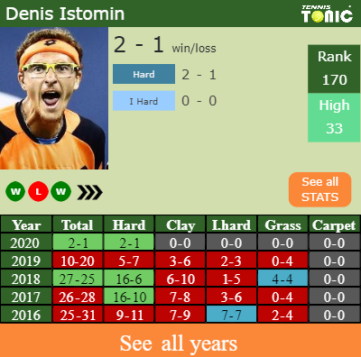 Istomin has a 2-1 win-loss record in 2020, 2-1 on hard (See FULL STATS).