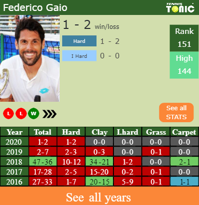 Gaio has a negative record in the last 10 years having won only 37% of his matches (130-225). 1-2 on hard in 2020. . In connection with his performance on the same surface of this competition, Gaio has a 143-157 record in the last 10 years on hard.