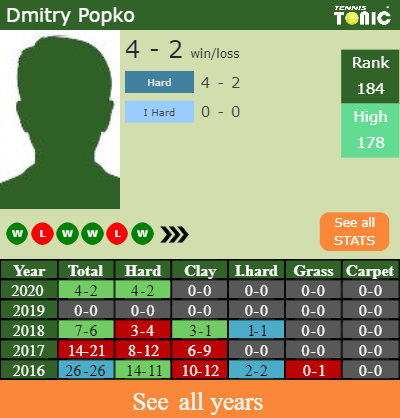 Popko has a weak record in the last 8 years having won 49% of his matches (157-153). 4-2 on hard in 2020. Talking about his performance on the same surface of this event, Popko has a 57-63 record in the last 8 years on hard.