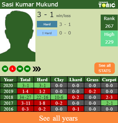 Kumar Mukund has a winning record in the last 7 years having won 51% of his matches (159-153). 3-1 on hard in 2020. In connection with his performance on the same surface of this competition, Kumar Mukund has a 52-57 record in the last 7 years on hard.