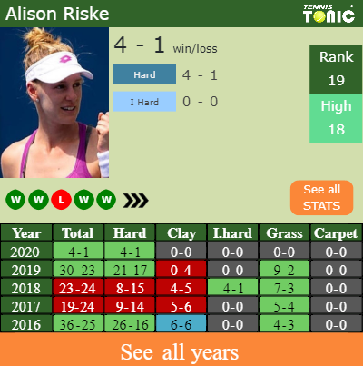 Riske has a good record in the last 10 years having won 51% of her matches (685-655). 4-1 on hard in 2020. Talking about her performance on the same surface of this competition, Riske has a 194-184 record in the last 10 years on hard.