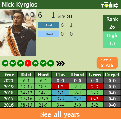 Kyrgios has a 6-1 win-loss record in 2020, 6-1 on hard (See FULL STATS).