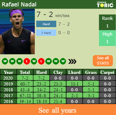 Nadal has a 7-2 win-loss record in 2020, 7-2 on hard (See FULL STATS).