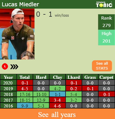 Lucas has a 0-1 win-loss record in 2020, 0-1 on indoor hard courts (See FULL STATS).