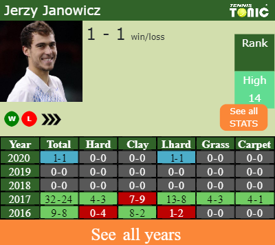 Janowicz has a 1-1 win-loss record in 2020, 1-1 on indoor hard courts (See FULL STATS).