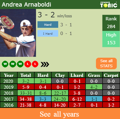 Arnaboldi has a 3-2 win-loss record in 2020, 0-1 on indoor hard courts (See FULL STATS).