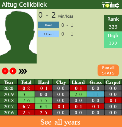 Altug has a 0-2 win-loss record in 2020, 0-1 on indoor hard courts (See FULL STATS).