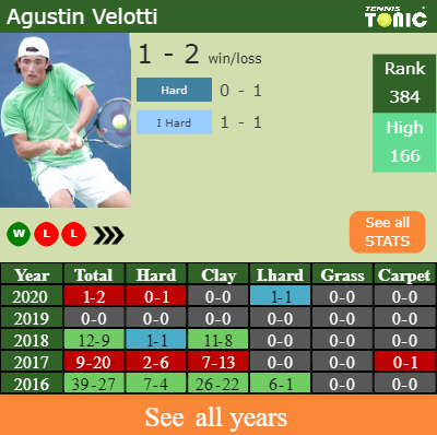 Agustin has a 1-2 win-loss record in 2020, 0-1 on hard (See FULL STATS).