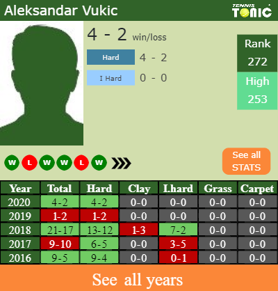 Vukic has a winning record in the last 6 years having won 56% of his matches (150-118). 4-2 on hard in 2020. Talking about his performance on the same surface of this event, Vukic has a 46-38 win-loss record in the last 6 years on hard.