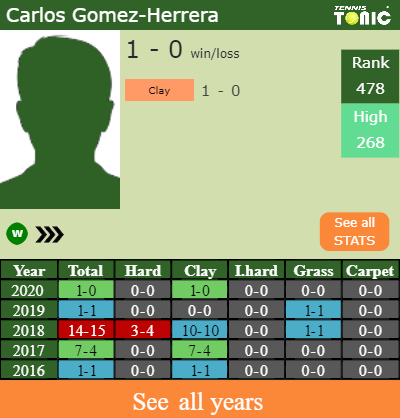 Gomez-Herrera has a winning win-loss record in the last 10 years having won 57% of his matches (213-163). 1-0 on clay in 2020. Talking about his performance on the same surface of this event, Gomez-Herrera has a 51-44 win-loss record in the last 10 years on clay.