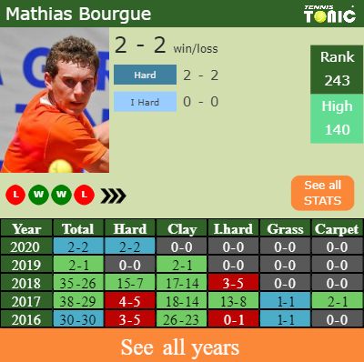Bourgue has a 2-2 win-loss record in 2020, 0-0 on indoor hard courts (See FULL STATS).
