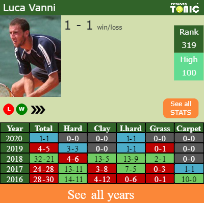 Vanni has a winning win-loss record in the last 10 years having won 51% of his matches (217-207). 1-1 on indoor hard courts in 2020. Talking about his performance on the same surface of this event, Vanni has a 152-148 record in the last 10 years on indoor hard courts.