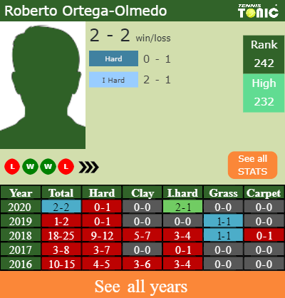 Talking about his overall career, Ortega-Olmedo has an overall 55-77 record. He has negative 12-14 record on indoor hard courts.