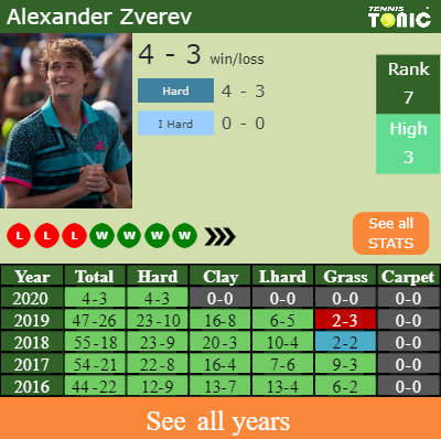 Zverev has a negative record in the last 8 years having won 33% of his matches (560-274). 4-3 on hard in 2020. In connection with his performance on the same surface of this competition, Zverev has a 294-154 record in the last 8 years on hard.