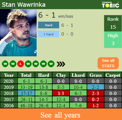 Wawrinka has a fantastic record in the last 10 years having won 72% of his matches (788-309). 6-1 on hard in 2020. Regarding his performance on the same surface of this tournament, Wawrinka has a 333-160 win-loss record in the last 10 years on hard.