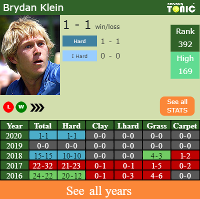Klein has a 1-1 win-loss record in 2020, 1-1 on hard (See FULL STATS).