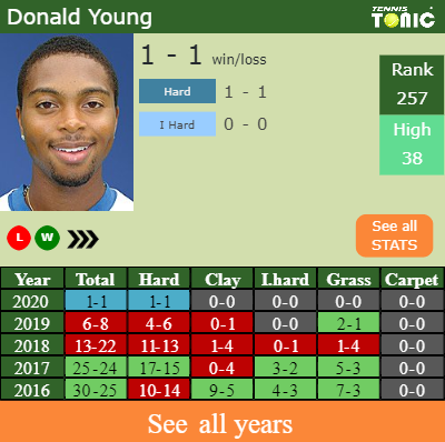 Young has a winning record in the last 10 years having won 52% of his matches (611-563). 1-1 on hard in 2020. Regarding his performance on the same surface of this event, Young has a 239-209 win-loss record in the last 10 years on hard.