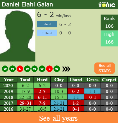 Elahi Galan Riveros has a winning record in the last 8 years having won 51% of his matches (180-173). 6-2 on hard in 2020. In connection with his performance on the same surface of this event, Elahi Galan Riveros has a 114-111 record in the last 8 years on hard.