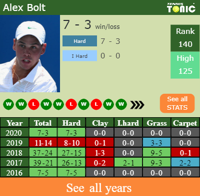 Bolt has a weak record in the last 8 years having won 41% of his matches (498-346). 7-3 on hard in 2020. In connection with his performance on the same surface of this event, Bolt has a 150-120 record in the last 8 years on hard.
