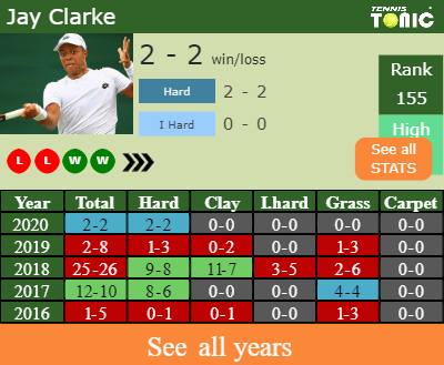 Clarke has a 2-2 win-loss record in 2020, 2-2 on hard (See FULL STATS).