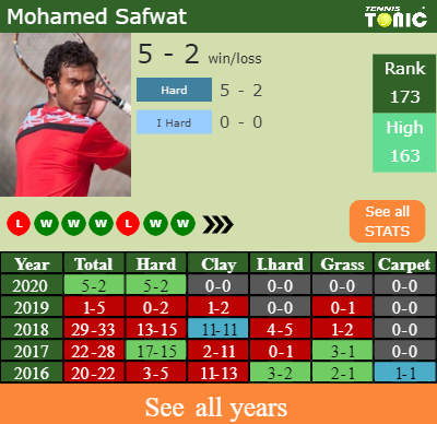 Safwat has a 5-2 win-loss record in 2020, 5-2 on hard (See FULL STATS).
