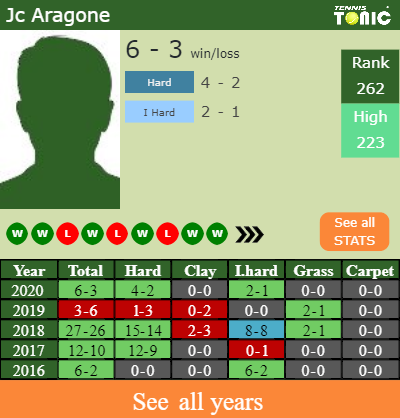 Aragone has a 6-3 win-loss record in 2020, 4-2 on hard (See FULL STATS).
