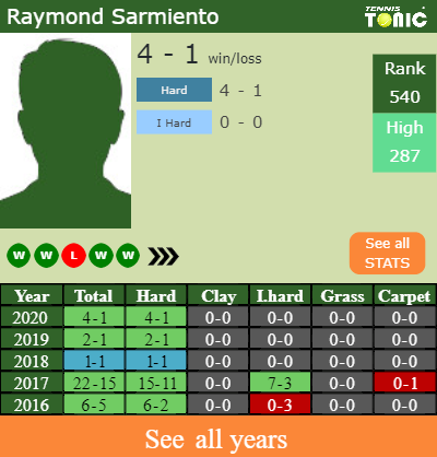 Sarmiento has a solid win-loss record in the last 10 years having won 62% of his matches (248-155). 4-1 on hard in 2020. In connection with his performance on the same surface of this event, Sarmiento has a 49-36 record in the last 10 years on hard.