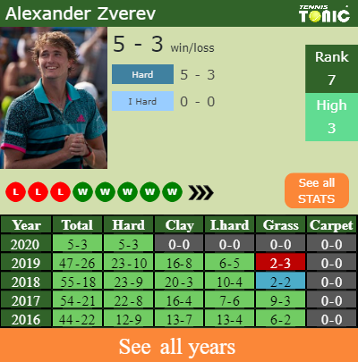 Zverev has a 5-3 win-loss record in 2020, 5-3 on hard (See FULL STATS).